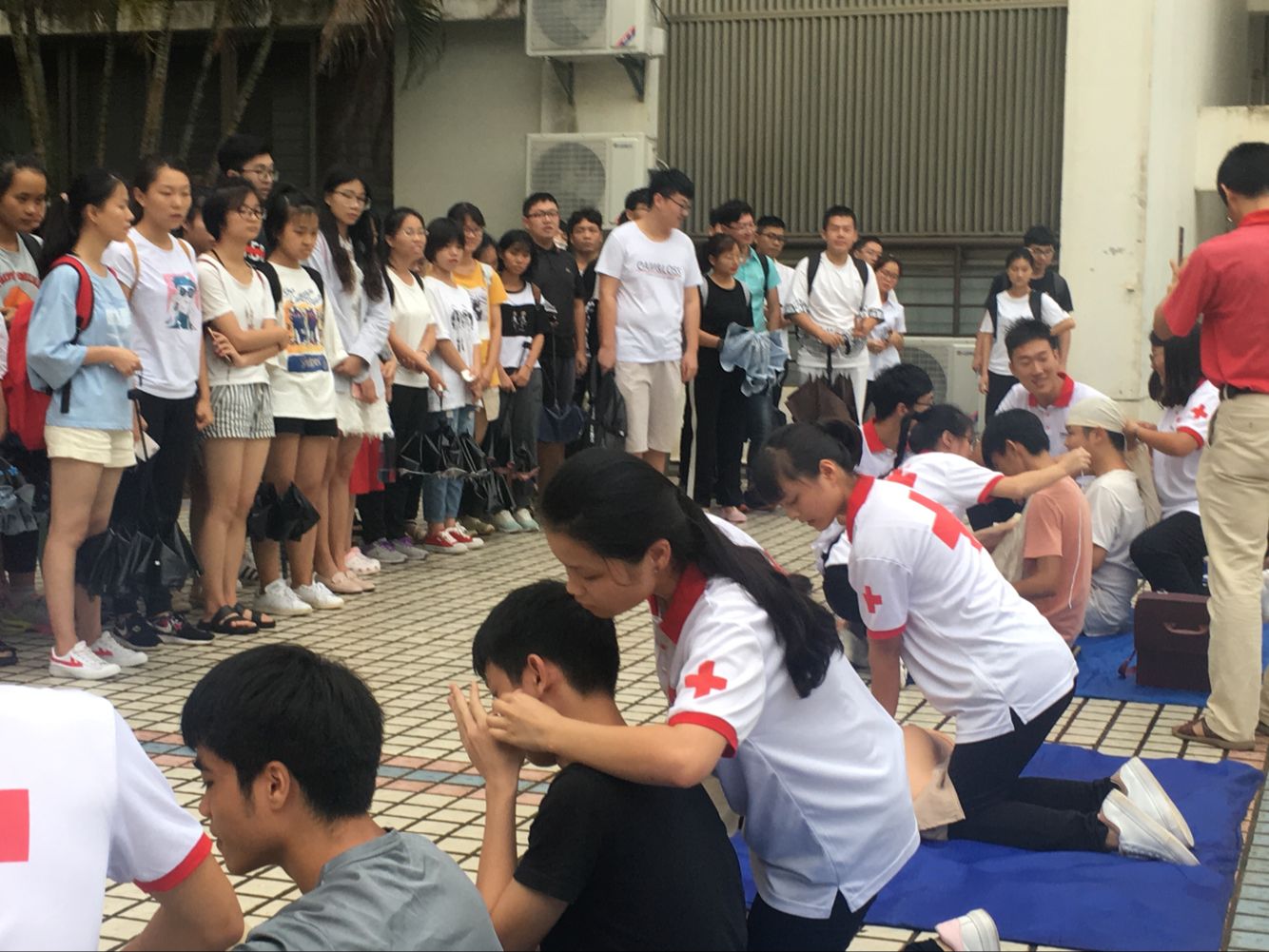 演练前工作人员清点了教室上课的学生人数,对地域空间、逃生路线等进行全方位布置并做好疏散前管理工作。然后,根据不同楼梯学生分流的情况安排安保人员在相应楼梯间值勤,做好现场指挥。随着消防安全警报拉响,立即组织学生进行疏散逃生演练,学生们捂住鼻子和嘴巴,弯着腰,扶着墙壁,按疏散路线有秩序地迅速撤离,到达指定地点汇合后,再次清点人数,在集合地点对消防器材的正确使用方法进行了讲解和演练并现场讲解与示范急诊创伤的心肺复苏及包扎方法等活动,消防演习圆满落下帷幕。通过一场体验式的逃生演练及情景式的灭火展示,给全体师生上了一堂生动的消防安全课。