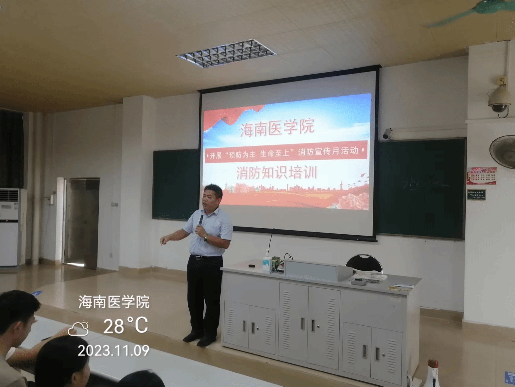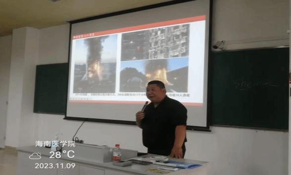 11月9日下午4:30,在2-301教室开展消防安全知识培训,我处邀请海南居安消防防灾减灾宣传服务中心高级讲师符东龙,给2023级部分新生、宿舍管理科的安全责任人、楼管、电工、保安、负责学生公寓消防检查的学生等人员进行授课,人数约350人,课前首先观看火灾警示教育视频,根据实际情况,重点讲解如何排查消防安全隐患、如何扑救初起火灾、如何火场逃生自救、灭火器材使用等!将消防知识传播给全校师生员工,提升全校师生员工的消防安全意识,遏制火灾事故发生。