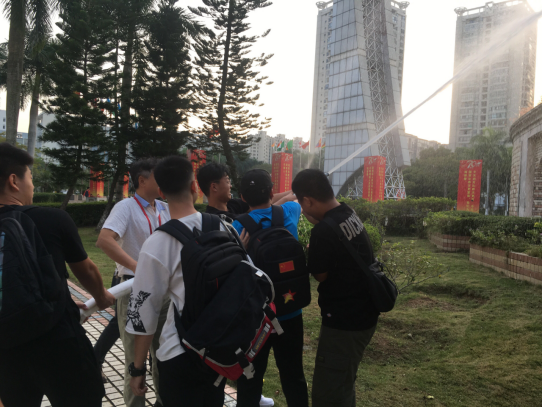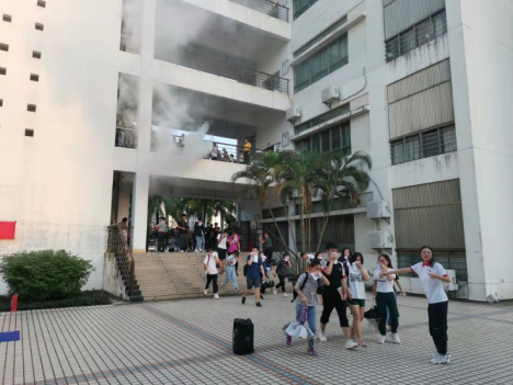 2019年11月8日下午5时25分第二教学楼突然浓烟滚滚、疏散警报响起,老师和同学们用湿毛巾捂嘴弯腰跑到安全地带,由保卫处联合学生工作处、团委和物业服务公司共同举办的 2019年“11·9”大学生消防应急救护演练活动正式拉开帷幕。