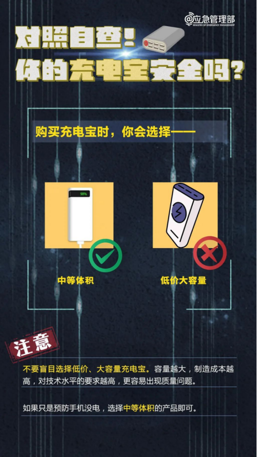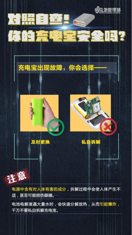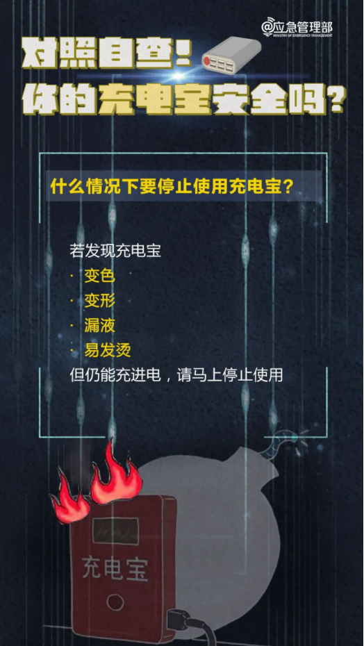 很多因充电宝引发的意外令人触目惊心国家市场监管总局不久前发布的网售移动电源产品质量监督抽查结果显示在抽查检验的99批次产品中有35批次不合格抽查不合格率35.4%你的充电宝安全吗?什么情况下要停止使用充电宝?请对照自查!↓↓↓