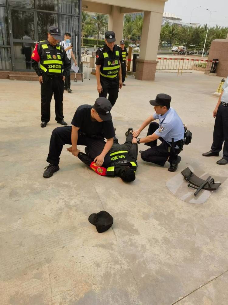为进一步加强安保队伍面对突发恐怖事件的处置能力,强化学校安保队伍建设,进一步增强学校保安的反恐防暴意识与警校联动应急处置能力,4月20日上午10点,保卫处邀请城西派出所在学校南门组织开展反恐防暴应急技能演练活动,20多名保安人员参加了演练,保卫处全体人员参加观摩。