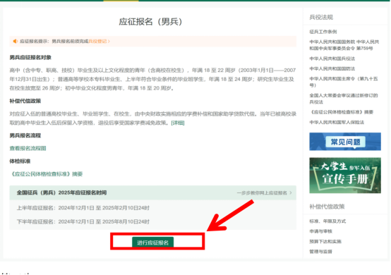 报名时间以及参军政策说明,建议大家认真阅读后,点击“进行应征报名”,迈出你军旅生涯的第一步!