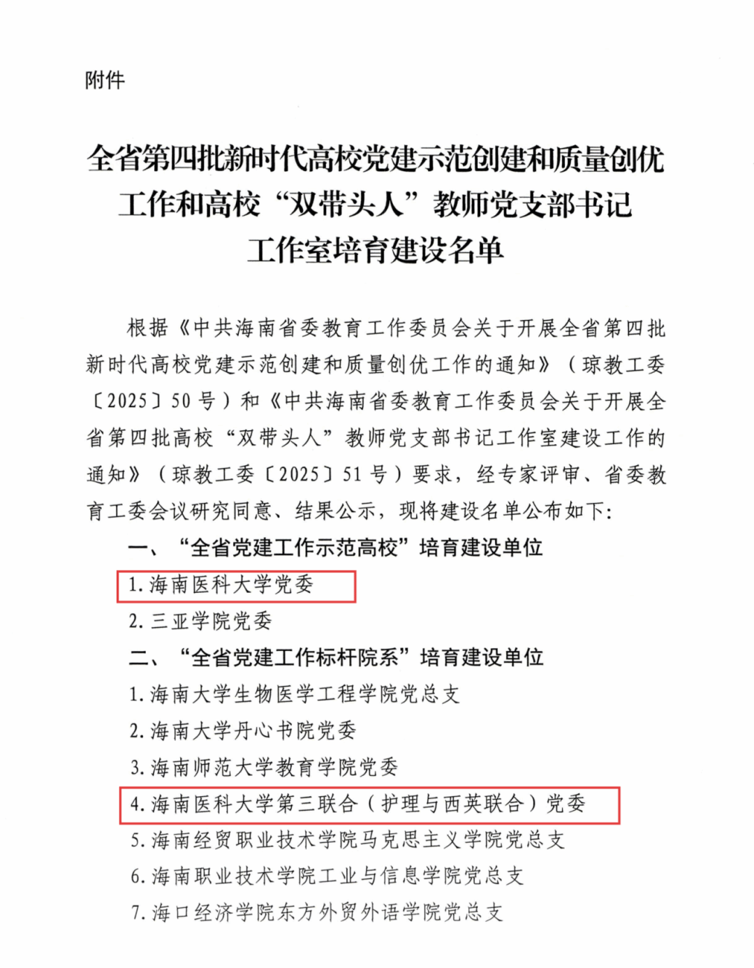近日,中共海南省委教育工作委员会公布全省第四批新时代高校党建示范创建和高校“双带头人”教师党支部书记工作室培育建设名单。我校党委入选“全省党建工作示范高校”培育建设单位。