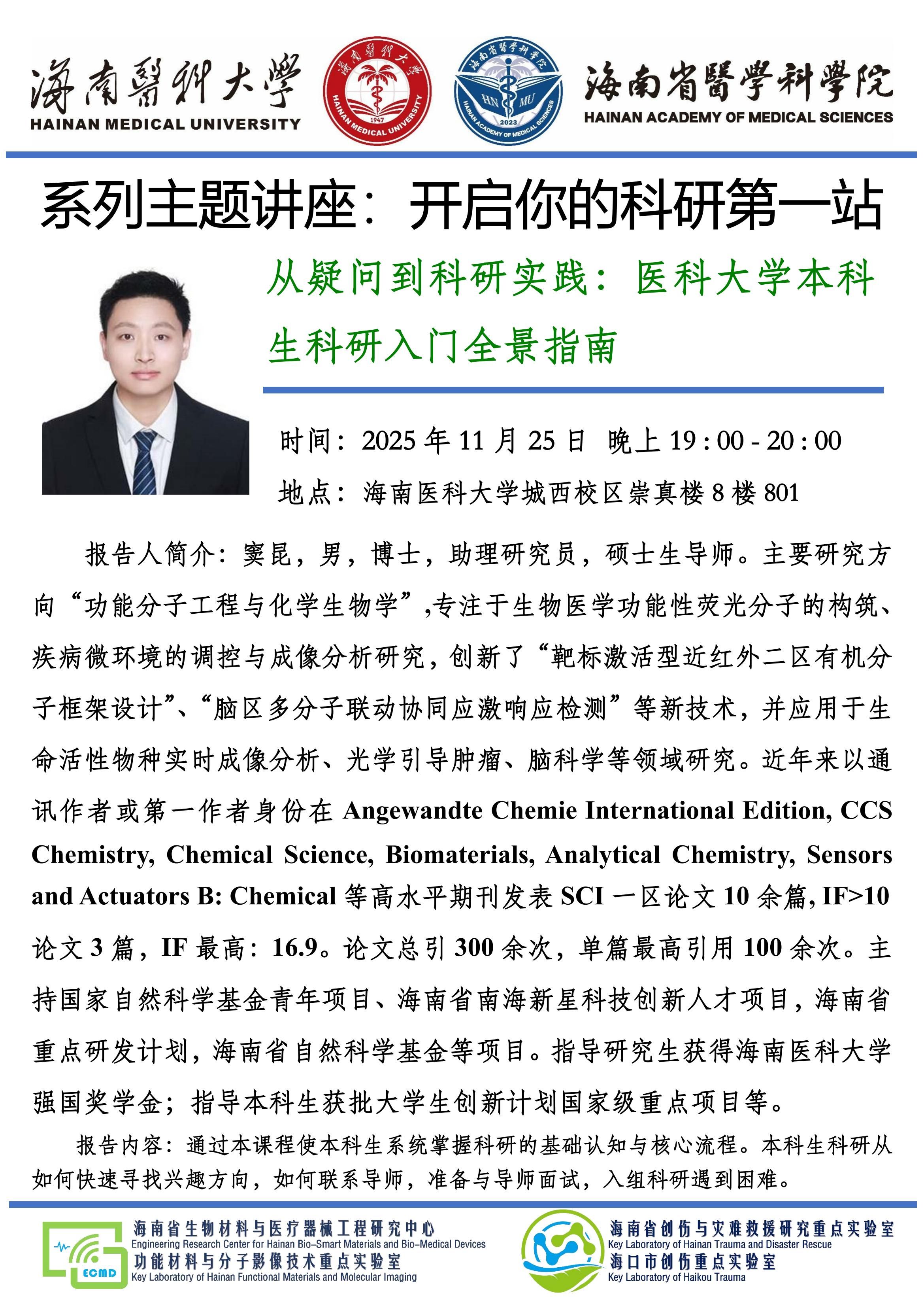 海南医科大学西英格兰学院科研启航计划系列主题讲座-开启你的科研第一站 从疑问到科研实践:医科大学本科生科研入门全景指南-窦昆