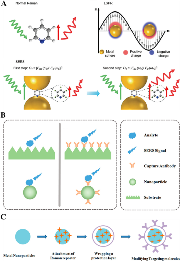 图1 (A)SERS中常规拉曼、局域表面等离子体共振(LSPR)和电磁增强机制的示意图;(B) 无标记SERS检测原理:吸附介导的无标记SERS检测和抗体/配体介导的无标记SERS检测;(C) 典型SERS探针的制备流程SERS能够实现单分子检测在很大程度上是由于吸附在纳米结构金属上,如金或银纳米颗粒表面的那些分子对非弹性光散射的增强(106~108)。与其他高灵敏度技术相比,SERS检测无需复杂的样品制备程序,减少了前处理步骤。总体而言,SERS正迅速成为在生物分析、疾病检测和诊断中成功应用的重要分析技术。此外,生物相容的SERS活性纳米颗粒或底物可以涂覆适当的表面活性剂或保护壳,以提高其在生物环境中的稳定性。这些纳米颗粒或底物可以用于直接检测或通过特定受体、适体等实现间接检测,从而实现对生物分析物的高效识别。无论是直接检测还是间接检测,SERS技术都表现出高精度和卓越的灵敏度,能够为乳腺癌转移的早期诊断和治疗评估提供可靠的检测手段。SERS技术包括直接检测和间接检测两种方法。直接检测是指通过分析目标分子的固有拉曼指纹信号来识别目标分子,无需任何外部信号标记(图1B) 。这种方法具有较强的吸引力,尤其在单分子层面的高灵敏度检测中表现突出,因为它能够直接获取目标分子的独特信息,避免了传统方法中可能引入的干扰或误差。然而,其实际应用受限于两个关键问题:一是大多数生物分子本身的拉曼散射截面较小,信号微弱。二是在生物体系中,纳米探针表面易被血清蛋白吸附形成“蛋白质冠”,该结构不仅屏蔽活性位点,还会显著削弱SERS信号强度,降低选择性,并影响体内循环稳定性。相比之下,间接SERS检测能在一定程度上克服直接检测的不足。该方法通常利用各种有机分子作为拉曼报告分子修饰在贵金属纳米颗粒表面,并在其外层包覆保护壳,同时连接特异性的靶向配体,从而实现对蛋白质、DNA及其他生物标志物的间接检测(图1C)。在间接SERS检测中,通过将靶向部分连接到纳米材料上,然后将SERS标签结合到分子靶标上并通过报告分子的拉曼信号来识别靶标。与自发拉曼散射相比,SERS信号在纳米尺度上的显著增强,使其能够检测到极低浓度甚至是单分子级别的生物分子。通过在SERS探针表面修饰靶向单元(如单克隆抗体、小分子配体或特异性肽链),可以实现对乳腺癌相关分子,如人类表皮生长因子受体2型(Human epidermal growth factor receptor 2,HER2)、表皮生长因子受体(Epidermal growth factor receptor,EGFR)以及黏蛋白1(mucin 1,MUC1)的特异性识别。靶向单元与肿瘤细胞表面受体高度亲和结合,有效提升信号的选择性,从而降低背景干扰。这种策略不仅增强了检测的可靠性,也有助于区分肿瘤细胞亚群,为肿瘤异质性分析提供数据支持。SERS技术可与其他临床影像手段和分子影像技术整合,实现多模态成像。SERS在分子层面提供高分辨率、指纹特征的信息,而其他成像技术则具备宏观结构显示或解剖定位功能。多模态融合不仅提升了成像的准确性与空间分辨率,还可用于乳腺癌病灶的多维度可视化,如检测肿瘤的确切位置、边界清晰度及潜在转移灶。SERS与荧光成像、MRI等联用,可同步实现微观检测与宏观观察,为精准诊断提供更可靠的依据。在乳腺癌转移的实时监测中,SERS具备较高的检测灵敏度和快速响应能力,能够在不需复杂样本前处理的前提下,实现对微量CTCs、Exos的直接检测。其窄峰宽、低背景干扰的光谱特性,使其能够精确区分结构相似的生物分子,克服传统荧光检测存在的光谱重叠问题。此外,与苏木精-伊红染色(Hematoxylin-eosin staining,HE染色)、免疫组织化学(Immunohistochemistry,IHC)聚合酶链式反应(Polymerase chain reaction,PCR)等常规方法相比,SERS可实现即时光谱获取,大幅提升检测效率,尤其适用于术中快速评估和病程动态监测。乳腺癌是一种具有高度分子异质性和易转移特征的恶性肿瘤,不同患者、甚至同一患者体内不同部位的肿瘤细胞,往往存在显著的分子表达差异。例如,HER2、雌激素受体(Estrogen receptor,ER)、孕激素受体(Progesterone receptor,PR)等标志物的表达水平可因细胞亚群的异质性或肿瘤微环境的变化而发生下调或缺失。这种情况容易导致单一标志物检测出现漏检,从而影响疾病的准确诊断与治疗决策。SERS探针通过设计多靶点识别平台,能够同时携带多个拉曼报告分子,靶向不同的分子标志物。这种多重检测策略可显著提升对乳腺癌相关生物信号的捕获能力,提高检测的灵敏度和特异性,有效降低假阴性率。例如,同时识别HER2、EGFR以及MUC1等,可涵盖更广泛的乳腺癌亚型,从而弥补单一标志物可能遗漏的病灶信息。从临床角度来看,识别多个分子标志物不仅有助于精准定位微小或隐匿的转移灶,还可用于评估肿瘤的侵袭性和耐药性,为制定个性化治疗方案提供重要依据,特别是在术前分型、术中导航及术后疗效追踪等环节,多靶标检测能够为临床提供更全面、动态的疾病信息,辅助医生实现更早期、更准确的干预。此外,多标志物策略也适用于监测治疗相关生物变化,例如肿瘤微环境中免疫细胞浸润、上皮-间质转化(Epithelial-mesenchymal transition,EMT)过程的标志物变化等,为抗药机制研究及新靶点筛选提供了强有力的技术支持。因此,基于SERS的多靶标检测平台不仅是应对乳腺癌分子复杂性的有效手段,也为推进精准医学提供了可行的解决方案。为进一步提高乳腺癌