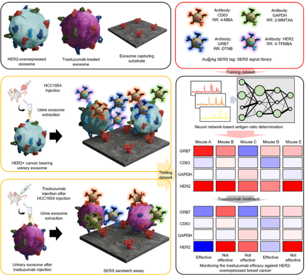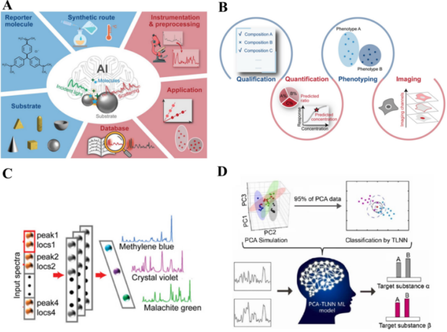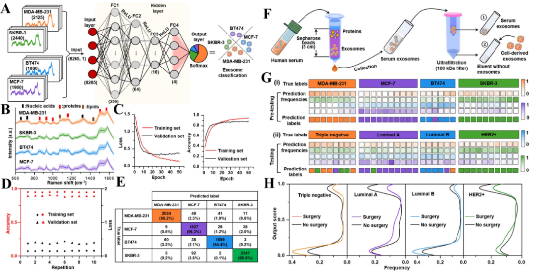 乳腺癌亚型种类较多,且相关肿瘤细胞系复杂,SERS技术可针对乳腺癌不同分子亚型的疗效进行有效评估。乳腺癌的分子分型通常依据雌激素受体(Estrogen receptor,ER)、孕激素受体(Progesterone receptor,PR)和人表皮生长因子受体-2(Human epidermal growth factor receptor 2,HER2)的表达情况进行评估。ER和PR在约75%的乳腺癌中表达,它们是激素治疗的预后标志物,其表达为阳性通常显示具有较低的侵袭性。HER2过度表达的乳腺癌约占15%,其侵袭性较强,但对HER2靶向治疗反应较好。其余10%~15%的乳腺癌为三阴性乳腺癌(Triple negative breast cancer,TNBC),这种类型缺乏ER、PR和HER2的表达,通常为高级别,且预后较差。激素受体阳性乳腺癌(ER+/PR+)对激素治疗(如选择性雌激素受体调节剂他莫昔芬、芳香化酶抑制剂来曲唑)响应良好。SERS可通过检测雌激素代谢物、ER表达或相关基因(ESR1)突变,识别耐药风险并辅助调整方案。HER2阳性乳腺癌,对靶向药物(如曲妥珠单抗、帕妥珠单抗)更为敏感,SERS可用于动态检测HER2、CTCs表达变化,评估是否适合抗体-药物偶联物(antibody-drug conjugate,ADC)治疗。在转移性乳腺癌伴随诊断中,监测药物疗效至关重要,针对HER2过表达的小鼠尿液外泌体发展了一种基于SERS免疫分析的深度学习辅助曲妥珠单抗疗效的监测方法(图6)。利用SERS-深度学习分析检测了五种细胞来源外泌体的抗原水平,从而分析监测药物疗效。图6 用于监测曲妥珠单抗在乳腺癌患者中的疗效的外泌体生物标志物的深度学习辅助SERS免疫测定的示意图乳腺癌转移与肿瘤细胞表面标志物及微环境密切相关,目前临床仍面临灵敏度不足和治疗评估困难的问题。为此,研究者开发了一种金银核壳纳米探针,通过靶向抗体和拉曼报告分子的修饰,实现了对肿瘤标志物的高灵敏度检测。在乳腺癌异种移植模型中,探针通过全身给药方式成功实现肿瘤标志物的动态监测,为治疗效果评估和手术切除范围确定提供了分子影像学依据。由于微小肿瘤切除不彻底,乳腺肿瘤手术常常面临术后致命性复发的风险。如能精确勾画肿瘤边缘并在术中实时清除微小肿瘤病灶,从而彻底切除肿瘤,将显著改善手术疗效,且降低肿瘤复发概率。基于靶向HER2的适配体构建的SERS探针具有超高检测灵敏度,且能显著抑制HER2的表达和细胞增殖,进而利用光热消融肿瘤细胞。在HER2阳性乳腺肿瘤小鼠模型中,可通过SERS成像引导手术切除和术中实时光热消除,能有效抑制肿瘤复发。保乳手术因其创伤小和美容效果好,成为乳腺癌患者的理想选择,但肿瘤切除不完全常导致复发。基于SERS的手术策略,能精确标定肿瘤边缘并实时消除显微肿瘤,确保肿瘤的完全切除,避免局部复发(图7)。该策略通过靶向HER2的SERS探针,结合高灵敏度检测、细胞增殖抑制和光热消融功能,在HER2阳性乳腺肿瘤小鼠模型中取得了100%的无瘤生存率,预示该方法有望提高HER2阳性乳腺癌患者的生存率。图7 表面增强拉曼散射成像引导的乳腺癌转移诊疗:(A) SERS成像引导手术流程图,包括术前肿瘤边缘勾画指导保乳手术、术中SERS检测以及实时光热消除手术床残留的微观肿瘤病灶三部分;(B) SERS探针结构示意图:以等离子金纳米星(AuSt)为核心,表面包裹对硝基苯硫酚(p-NTP)拉曼分子层,外层覆以二氧化硅壳层,最终通过HER2特异性适配体(HApt)实现靶向功能化;(C) SERS探针在HER2阳性乳腺癌荷瘤小鼠体内通过静脉给药后,借助增强渗透与滞留(EPR)效应及适配体HApt介导的主动靶向机制在肿瘤部位富集SERS成像技术还可与治疗手段相结合,构建“诊疗一体化”系统,为乳腺癌的精准治疗和疗效评估提供新路径。通过在贵金属纳米颗粒表面修饰特异性靶向配体(如抗体、适配体)以及治疗分子(如光敏剂或化疗药物),可构建具有成像与治疗双重功能的SERS探针。这类探针不仅能够实现肿瘤组织的高灵敏、特异性定位和实时拉曼成像,还可在激光照射下激发治疗反应,完成光动力治疗(Photodynamic therapy,PDT)或光热治疗(Photothermal therapy, PTT),实现对肿瘤细胞的精准消融。近年来,人工智能(Artificial Intelligence,AI)技术的迅猛发展为复杂的SERS光谱数据分析提供了全新思路。借助深度学习、机器学习和模式识别等先进算法,AI能够高效从高维、复杂的SERS光谱中自动提取关键特征,显著提升数据处理效率与诊断准确率。更重要的是,AI可整合患者的多组学信息(如基因组、转录组、代谢组等),构建个体化风险评估与预后预测模型,为制定精准治疗策略提供坚实的数据支撑。AI算法在光谱背景校正、信号去噪及分类识别方面也表现出优越性能,特别是在区分良恶性病灶、识别乳腺癌分子亚型及追踪治疗响应过程中展现出巨大潜力。如图8所示,随着多功能纳米材料的不断优化、AI分析技术的深入融合以及临床大数据的积累,基于SERS的人工智能平台有望成为乳腺癌转移诊断与疗效评估的重要组成部分,助力精准医疗落地临床。基于SERS与人工神经网络(Artificial neutral network,ANN)相结合的外泌体分析方法,用于乳腺癌分子分型识别与术后疗效评估。首先采集了来自四种代表性的乳腺癌细胞系所分泌的外泌体包括MDA-MB-231(三阴性乳腺癌)、MCF-7(Luminal A)、BT474(Luminal B)和SKBR-3(HER2+)。如图9(A~E)所示,获取共计8265组SERS光谱数据,这些数据用于ANN模型的训练与验证,训练集与验证集按8∶2比例划分,并引入交叉验证和早停策略,以降低过拟合风险并提升模型的泛化