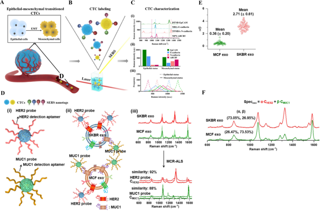液体活检作为一种无创性诊断技术,通过分析肿瘤来源的物质,如CTCs、EXOs、微小核糖核酸(MicroRNA,miRNA),具有早期诊断和动态监测的优势。液体活检能够克服乳腺癌肿瘤细胞的异质性,全面反映肿瘤组织的生化信息,为乳腺癌的早期诊断、治疗监测和手术评估提供了可靠的支持。上皮-间质转化(Epithelial-mesenchymal transition, EMT)是促进乳腺癌转移的关键机制,其通过促进CTCs从原发灶脱落、增强迁移侵袭能力、提高循环存活率、促进远端定植,增强CTCs的转移潜能。组织病理活检是当前EMT监测金标准,但SERS技术因其非侵入性和高灵敏度展现出替代潜力。基于CTCs表型特征及EMT动态过程的监测策略。EMT过程中,肿瘤细胞从上皮表型逐渐转化为间充质表型,这一转化使肿瘤细胞从原发灶脱离,侵入血管系统形成CTCs,进而通过血流播散至远端器官(图3A)。为实时监测CTCs的表型异质性,研究人员开发了一种SERS的多重纳米探针标记技术(图3B)。该技术利用四种金纳米探针分别靶向上皮标志物(EpCAM,1338 cm-¹)、E-钙黏蛋白(E-cadherin,1080 cm-¹)、N-钙黏蛋白(N-cadherin,1379 cm-¹)和肿瘤干细胞标志物(ABCB5,1000 cm-¹)。通过SERS光谱分析(图3C(i)),我们能够同时检测不同CTCs亚群的表型特征。结合多重标记策略(图3C(ii)),可实现对CTCs群体的精准分型。此外,由于SERS信号强度与标志物表达水平呈正相关,我们进一步构建了CTCs表型异质性分析模型(图3C(iii))。在该模型中,信号强度的分布宽度直接反映CTCs群体的异质性程度。分布范围越宽,拉曼信号分布特征可定量表征CTCs的异质性,信号分布宽度与CTCs表型多样性呈正相关。该技术通过同步检测上皮标志物、E-钙黏蛋白等EMT标志物,为乳腺癌转移预警和治疗反应监测(新辅助化疗后异质性降低)提供了新型分子工具。外泌体是一类由细胞分泌的纳米级囊泡,广泛存在于各种体液中,作为细胞间信息传递的重要媒介,能够携带多种生物活性分子,如蛋白质、脂质、DNA和多种类型的RNA(包括miRNA和lncRNA)。近年来研究表明,肿瘤来源外泌体在乳腺癌的发生、发展、转移及治疗反应中发挥着关键作用。它们不仅参与调控肿瘤微环境、促进血管生成和免疫逃逸,还可通过与靶细胞相互作用改变其生物学行为。由于外泌体分子组成与肿瘤状态密切相关,因此被视为一种具有巨大潜力的无创生物标志物,能够用于乳腺癌的早期诊断、预后判断以及疗效监测。如图3D(i, ii)所示,SK人乳腺癌细胞3系(SK breast cancer 3,SKBR3)和密歇根癌症基金会-7细胞(Michigan cancer foundation-7,MCF)来源的外泌体分别与HER2和MUC1适体探针孵育的示意过程。通过使用高浓度等摩尔比的适配体探针,实现对靶标分子的饱和识别。通过多元曲线分辨-交替最小二乘法(MCR-ALS)对单外泌体SERS光谱进行解析,成功解卷积获得两个特征端元光谱,分别对应HER2特征谱(α系数,主要峰位:1580 cm⁻¹)、MUC1特征谱(β系数,特征峰:1120 cm⁻¹)。各外泌体中α/β比值可定量反映HER2与MUC1的相对表达水平,为乳腺癌分子分型提供单囊泡水平的多参数分析(图3D(iii))。SKBR-EXOs与MCF-EXOs的平均强度比值(α/β)统计分布图,显示出两者在表面标志物表达方面存在显著差异(图3E)。该结果与蛋白质免疫印迹(Western blotting,WB)检测HER2/MUC1表达比值高度一致,从侧面验证了解混模型的可靠性。SERS光谱重构证实HER2/MUC1信号加权可精确解析EXOs表面标志物(图3F)。这一模型展示了基于SERS的单外泌体分析全流程技术路线,实现了从外泌体捕获到分子表型解析的一体化分析。