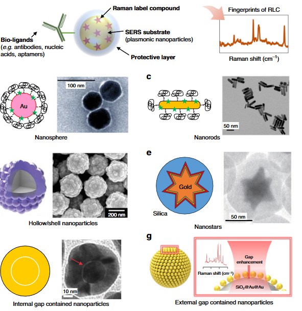 1.核心组件:包括 plasmonic 纳米基底(Au/Ag 纳米球、纳米棒、纳米星等)、拉曼标记化合物(RLCs)、保护层(PEG、二氧化硅等)及生物配体(抗体、适配体等)。