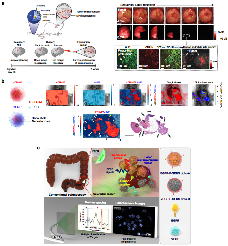 1.总结:SERS 技术通过纳米探针优化与仪器创新,已在体内传感、肿瘤诊疗、术中导航等领域取得突破性进展,成为连接基础研究与临床应用的关键技术。其核心优势在于高特异性、多重检测能力及 “成像 - 治疗” 一体化潜力,弥补了传统成像技术的短板。