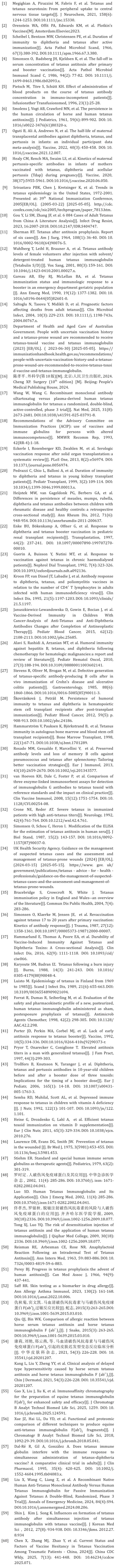 Karyoute和Badran[38]报道1例3个月前进行过TTCV加强免疫的儿童在烧伤后发生破伤风[38]。Luisto[39]报道8例曾在10年内进行过TTCV加强免疫的破伤风病例。