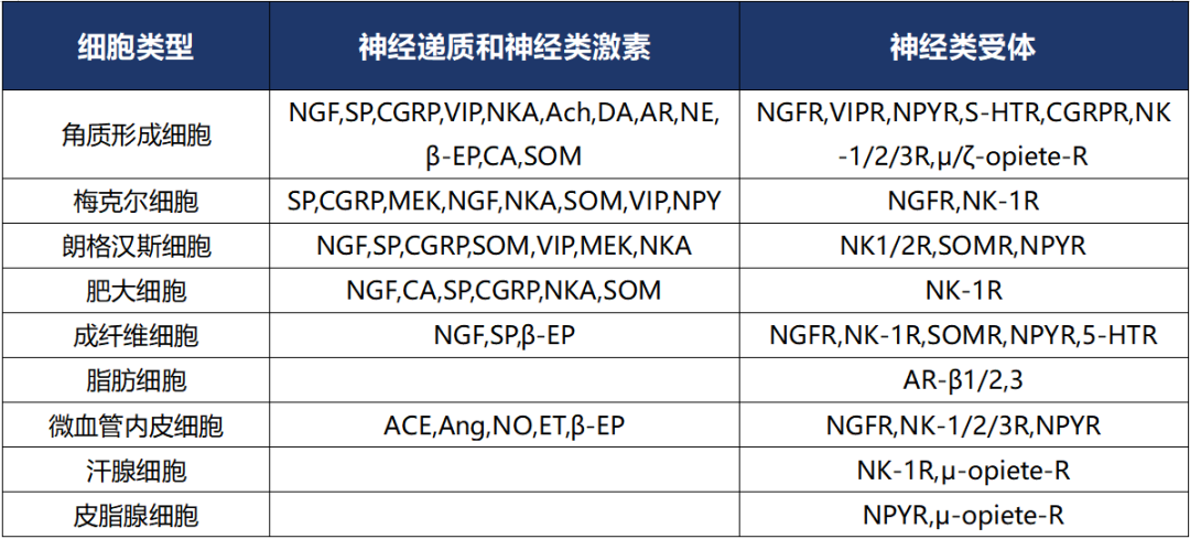 皮肤是人体最大的对神经极其敏感的器官。来自背根神经节的感觉神经通过真皮,在真-表皮交界处平行走行,穿透基膜,垂直到达表皮颗粒层,构成三维立体网络。不同年龄表皮神经的密度不同,不同部位的感觉阈也不同,随年龄增加表皮的神经密度下降。皮肤细胞能行使类似神经细胞的功能,表达神经递质及其受体,见表1。