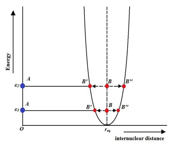 分子吸收红外辐射后发生振动能级和转动能级的跃迁,因而红外光谱又称为分子振动-转动光谱,分子不是一个刚体,分子中原子以平衡点为中心,以非常小的振幅作周期性振动(图2为红外工作原理示意图)。用经典力学方法可把最简单的双原子分子的振动形式用两个刚性小球的弹簧振动来模拟。
