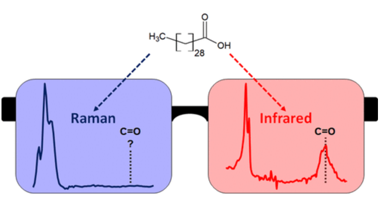 红外光谱与拉曼光谱同属于分子振动光谱,但红外光谱是吸收光谱,拉曼光谱是散射光谱,两者机制不同,但互为补充(图1所示)。红外是看“光没了多少”;拉曼是看“光偏了多少”。