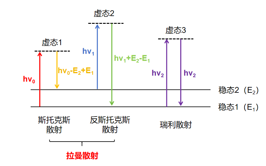 拉曼散射主要分为:斯托克斯散射(Stokes scattering):入射光子将能量传递给分子,使分子从基态振动能级跃迁到较高能级,散射光子的频率低于入射光的频率;反斯托克斯散射(Anti-stokes scatering):入射光子从已经激发的分子处获取能量,导致散射光子的频率高于入射光的频率。