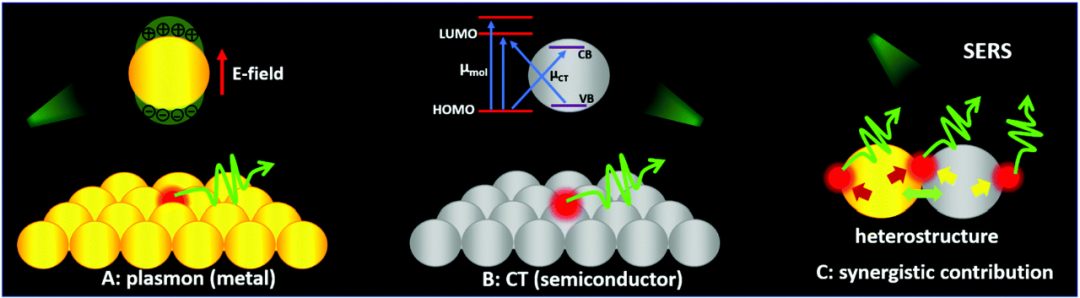 通常情况下,电磁增强与化学增强并非相互排斥,而是共同贡献于整体SERS信号。如图4所示,在金属-半导体异质结构中,等离激元与CT的协同作用可产生前所未有的强SERS信号。