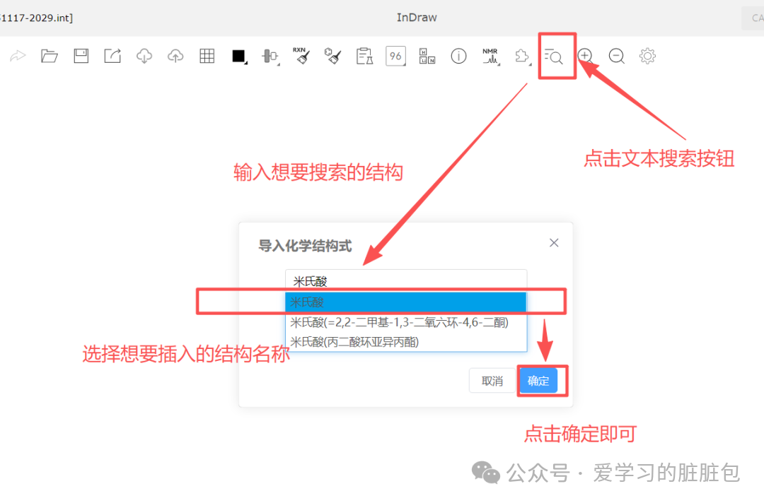在InDraw左侧工具栏中有许多化学结构式,我们在绘制简单化学结构时就可以通过简单操作,绘制出目标结构了,而且,把鼠标放在工具上,会自动跳出中文的功能介绍另外,我们截取文献或图片中的化学结构式,InDraw可一键识别,即使是复杂的手性化学结构图,InDraw也可快速识别出来,如下图准确率高达99%。InDraw也可快速截取当前页面的结构,就是在文献中看到一个结构我们还可以去查找目标结构的CAS号或中英文名称,indraw也支持一键导入化学结构式,甚至可以识别部分中文俗名。绘制结构式后InDraw 和ChemDraw相同,都可直接复制,粘贴到Word、PPT中,双击PPT中的结构式即可在InDraw中编辑和修改。