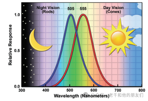 图6 眼睛在夜视和日视时的光谱响应。这两条曲线的峰值灵敏度被归一化为1.0;然而,夜视(视杆细胞)的灵敏度是日视(视锥细胞)的40倍。视杆细胞中的视紫红质和视锥细胞中的颜色受体色素具有不同最大值和光谱范围的作用光谱。