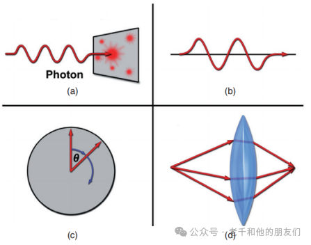 图4 作为 (a) 量子、(b) 波、(c) 矢量和 (d) 作为射线的光