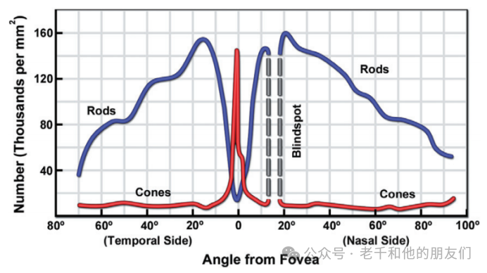 图7 视网膜中视杆细胞和视锥细胞的分布。每平方毫米的细胞数相对于从晶状体看到的视网膜中央凹的角度绘制。视网膜中央凹的特点是视杆细胞稀少,视锥细胞丰富。盲点缺少感光细胞。