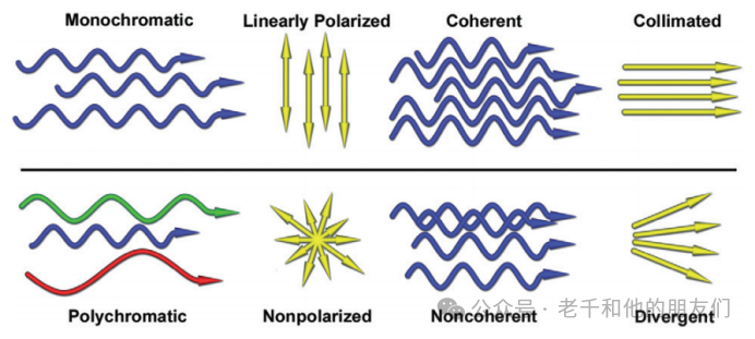 - 单色光。具有相同波长或振动频率(相同颜色)的波。-偏振光。E矢量在相互平行的平面上振动的波。从玻璃片上反射的太阳光的E 向量平面平行,称为线性偏振。- 相干光。特定波长的波在空间传播时保持相同的相位关系(激光是相干的、单色的和偏振的)。- 准直波。波在空间的传播路径同轴,即没有会聚或发散,但波长、相位或偏振状态不一定相同。准直光束横截面上任何一点的表面波面都是平面的,并且垂直于传播轴。