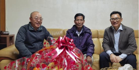党委书记刘云儒(左一)和院长宁毅(右一)看望郭忠武老师