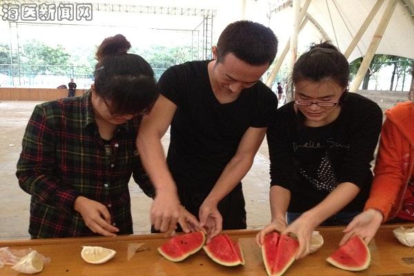本次此次比赛分为三个环节:团队比赛、个人比赛和游园活动。其中团体赛包括两部分,首先是“盲人摸果”,三人一组,猜出名字吃完即可,接着是由12人组成的团体接力,参赛队必须在规定时间内完成各种小游戏,用时最少的队伍获胜。在“我是大胃王”的个人赛中,选手们则是争分夺秒,尽可能快地吃完定量的水果。随后的游园活动包括背挤气球,空杯运球。比赛开始后,各参赛队齐心协力、互助合作、争分夺秒;场外的拉拉队则大声地呐喊助威。活动现场气氛热烈,阵阵呐喊声、欢快的笑声交织在一起,回荡在校园的上空。最后,王基鸿书记和冯绰姬老师为获胜参赛队颁发了奖金。并希望大家能在活动中增进友谊,享受活动的快乐。