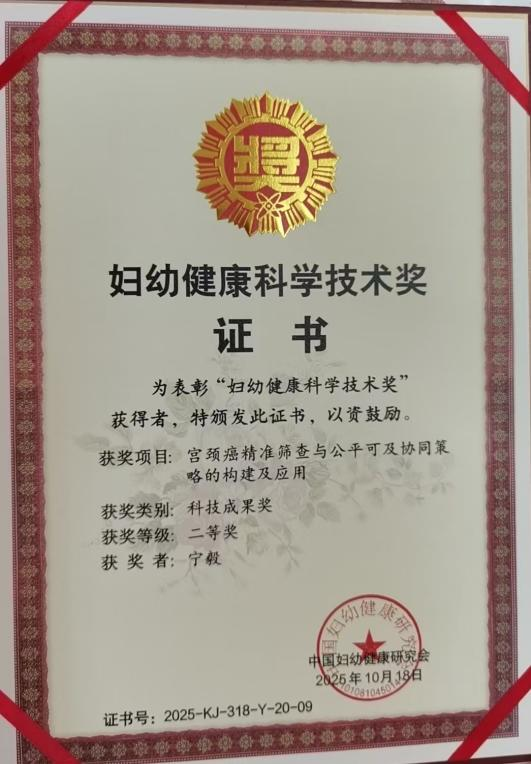 近日,“妇幼健康科学技术奖”评选结果揭晓,我校公共卫生学院宁毅教授凭借“宫颈癌精准筛查与公平可及协同策略的构建及应用”研究,荣获科技成果奖二等奖。