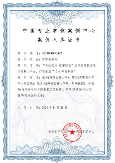 近日,由我校张华教授联合海南省万宁市人民医院、海南医科大学第一附属医院、海南省运动与健康促进重点实验室的专家学者共同完成的研究型案例《“科技助力 数字赋能”区域创伤救治急诊急救大平台,打造基层“15分钟急救圈”》正式收录至中国专业学位案例中心案例库,并获颁案例入库证书(案例编号:2024000150382)。该案例此前获批教育部学位与研究生教育发展中心主题案例立项,顺利结项后并成功入库,标志着我院在专业学位案例开发方面取得突破。
