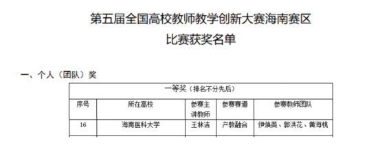 近日,第五届全国高校教师教学创新大赛海南赛区评选结果揭晓,海南医科大学国际护理学院在教学创新大赛中取得新突破——王林洁教师团队(伊焕英、郭洪花、黄海桃)展示了课程《妇产科护理学》的产教融合创新成果,荣获产教融合组一等奖。这一荣誉不仅是对妇产科护理学团队与临床进行产教融合成效的高度认可,更是我校护理学专业在产教融合教育领域探索的里程碑式突破。