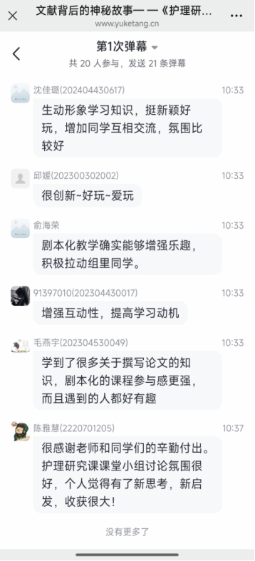 这种以 “剧本杀” 式互动方式开展的《护理研究》游戏化教学,给学生带来了全新的学习体验。学生们在课程分享感受环节纷纷表示,这种教学方式新颖创新,感觉“科研知识以一种奇妙的方式入脑入心”,由此,极大地激发了他们的学习兴趣,改变了抽象乏味的课堂气氛,在主动参与过程中,科研思维、评判性思维得到了充分拓展,也提升了发现问题及小组合作能力,为今后的学习和科研带来了诸多启发,希望更多的学生能够体验这种学习模式。
