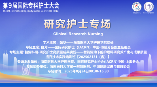 2025年8月24日,第九届国际专科护士大会·研究护士专场在上海交通大学医学院海南国际医学中心成功举办。此次专场由海南医科大学护理学院、国际研究护士协会(IACRN)中国-上海分会主办,海南医科大学第一附属医院与中国健康促进与教育协会协办,吸引了来自国内外的众多护理科研专家与学者参与。