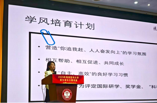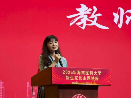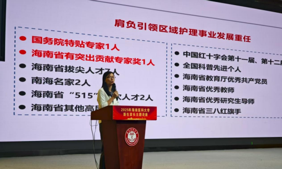 随后,学院院长、护理学专业负责人张华教授以“‘护助’有爱 奋楫笃行”为主题,为新生及家长带来精彩分享。张华教授从树意识、有信仰、守宗旨等方面展开讲解。她强调学院目前教学改革实现了创新突破,以生命全周期照护为核心,形成OBE理念贯穿的“三基四柱六梁”护理人才培养体系。希望同学们以“功成不必在我”的精神境界和“功成必定有我”的责任担当服务健康海南、海南自贸港建设。