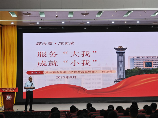 第三联合(护理与西英联合)党委书记张万科以“服务‘大我’,成就‘小我’”为主题2025级全体新生讲授开学第一课。张万科书记从世情、国情、省情、医情、校情、院情、豪情、心情等维度进行阐述。他深入剖析当下世界与国家发展态势,介绍海南地方情况与医疗领域状况。此外,他强调学院已为新生及家长搭建起良好的沟通平台,助力新生更好了解学院,为开启大学生活奠定基础,也让家长们对孩子未来的学习与成长更放心。