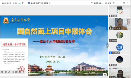 为精准部署2026年度国家自然科学基金申报工作,切实增强护理学科科研核心竞争力,9月24日,因台风天气调整会议形式后,护理学院线上召开“2026年度国家自然科学基金申报启动会”。学校科技发展研究院郭峻莉院长、南方医科大学陈瑜教授应邀作专题辅导,来自护理学院和三家附属医院近100名专职和临床护理教师线上参会。会议由张华院长主持。