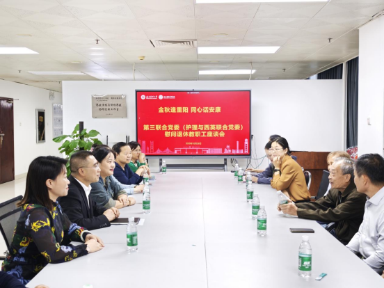 金秋送暖,岁岁重阳。10月29日重阳节之际,第三联合党委以“金秋逢重阳 同心话安康”为主题,举办退休教职工慰问座谈会,特邀原国际护理学院党委书记何启胜、原国际教育学院院长王华民重返校园,共叙情谊、共话发展。出席本次座谈会的有第三联合党委张万科书记,徐芳芳、蔡小霞副书记,西英格兰学院(国际教育学院)及护理学院教师代表。