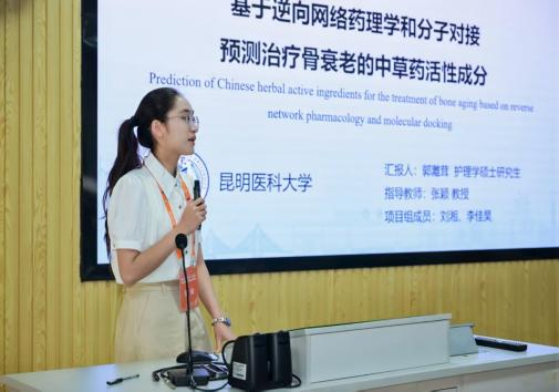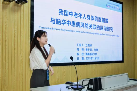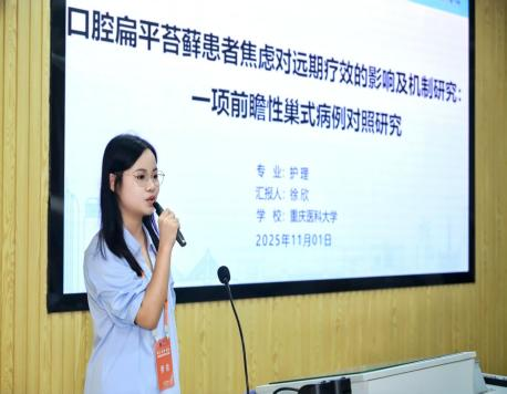 在学术报告环节,论坛学术氛围浓厚,研究内容精彩纷呈。来自哈尔滨医科大学的孙梦如、昆明医科大学的郭灕茸、安徽医科大学的王珠珠等研究生,先后报告了在季节性情感障碍与心血管事件关联、中草药抗骨衰老活性成分预测、肺癌合并肌少症患者体成分分析等前沿领域的最新研究成果,重庆医科大学的徐欣则从心身关联视角,深入探讨了口腔扁平苔藓患者焦虑对远期疗效的影响及机制研究。米洁教授对本组学生的汇报给予认可,均具有一定的前瞻性,建议在文章中写明研究框架,增加长期效果分析。