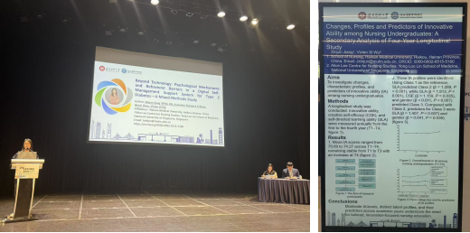 会议期间,蒋新军老师作口头报告“Beyond Technology: Psychological Mechanisms and Behavioral Barriers in a Digital Self-Management Support System for Type 2 Diabetes—A Mixed-Methods Study”,该研究探讨数字化自我管理支持系统的心理机制与行为阻碍因素,为优化和完善数字化自我管理支持系统提供了新的研究思路,受到与会学者的关注。蒋新军老师还以壁报形式展示“Changes, Profiles and Predictors of Innovative Ability among Nursing Undergraduates: A Secondary Analysis of Four-Year Longitudinal Study”,该研究基于四年纵向数据分析护理本科生创新能力的发展特征及其影响因素,为创新型护理人才培养提供循证依据。