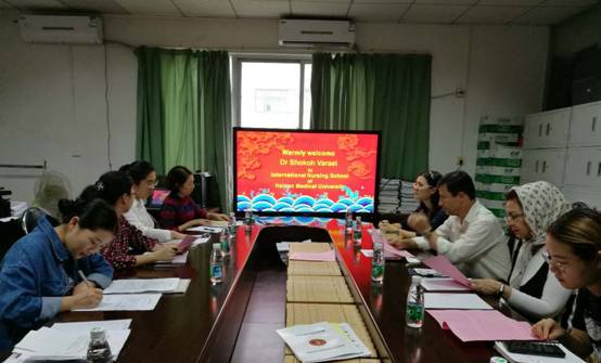 参加本次交流会的人员有伊朗德黑兰大学Shokoh Varaei教授、国际护理学院张彩虹院长、张华副院长、张宏玉教授、郭洪花副教授及其他老师。
