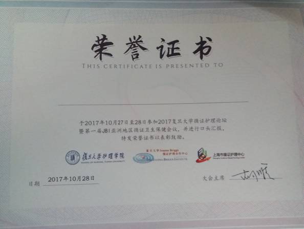 本次论坛还设立了“证据综合”和“证据应用”两个分会场,分别邀请了澳大利亚、泰国、中国台湾等国内外多个循证领域的专家围绕循证的理论、方法及实践方面的热点问题进行讨论分析,引导参会人员从循证理论到实践,从循证到用证等多个方面进行深入反思。在论文交流环节,大会设置了“证据生成”、“证据综合”、“证据应用”专场,来自全国各大医院及高校的42名研究者分享了其研究成果和经验。我校2016级研究生罗楠也应邀参加了此次的会议,并在会议上进行了以《间歇性口胃管在脑卒中吞咽障碍患者吞咽功能康复中的循证护理》为主题的口头汇报,与参会者分享研究成果,并获得大会颁发的荣誉证书。