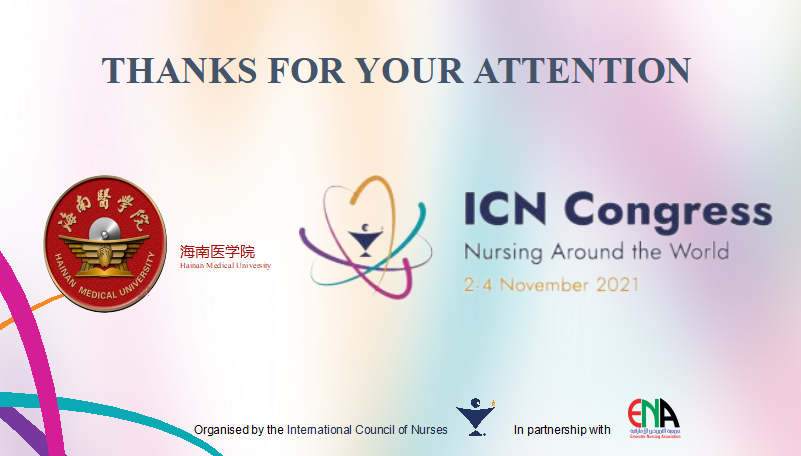 国际护理学院师生在护理学院领导和号召下,积极参与国内外学术会议。本次ICN国际护士大会,我院共有2名师生在国际护理大会上进行口头汇报,通过线上交流方式与全球各国护理领域专家近距离接触,展示海医护理科研创新成果,吸收全球护理领域的先进理念,了解护理学科动态及最新研究成果,深入研究和探讨全球护理未来发展趋势和走向。