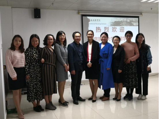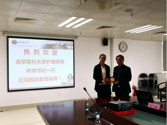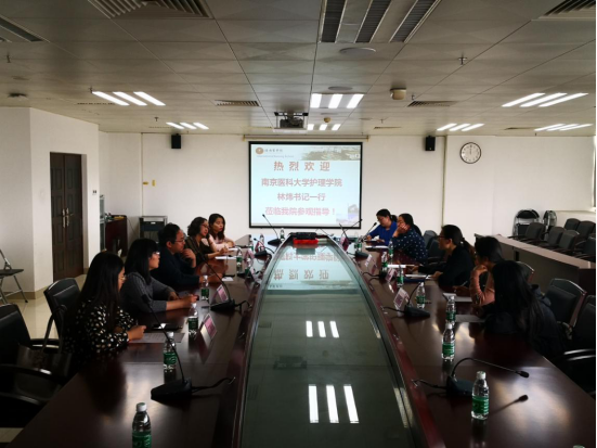 2019年11月29日上午,南京医科大学护理学院林炜书记、临床护理学系陈明霞主任、杨如美教师、丁晓彤教师、杨柳教师一行5人莅临我院交流。我校现代教育技术中心主任李春报、我院副院长张华、副院长王涛、综合办公室主任琚新梅、护理技能中心负责人韦玉敏、青年教师蒋新军、王林洁等参加接见。
