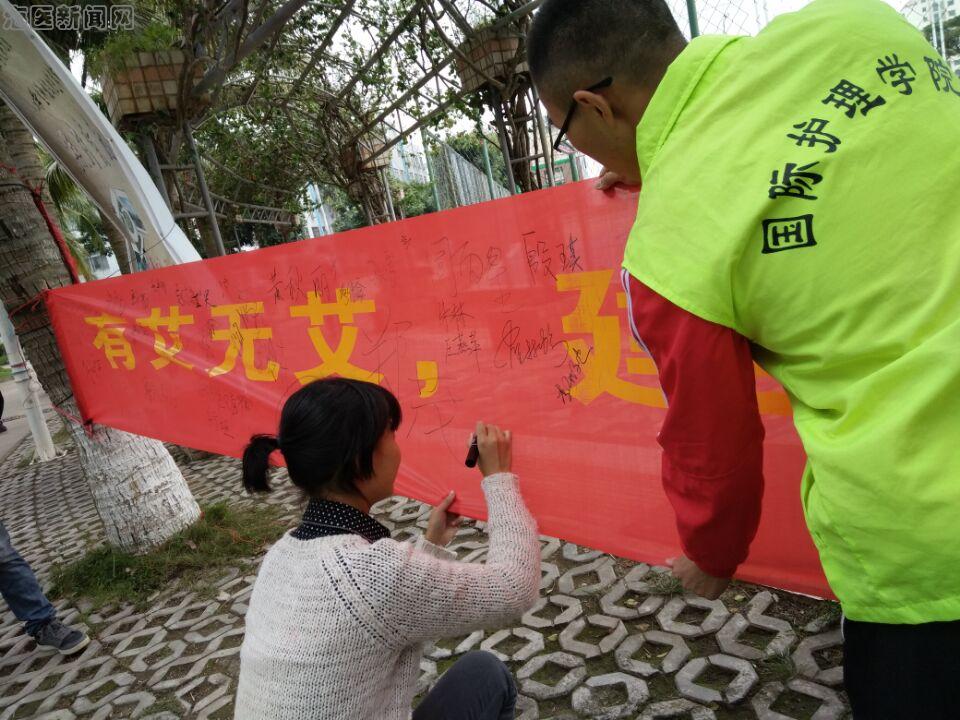活动现场首先举行了“有爱无艾,建设健康海口”签名仪式,号召广大同学们“共抗艾滋,共担责任,共享未来”。同学们都积极踊跃的参与进来。