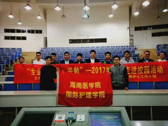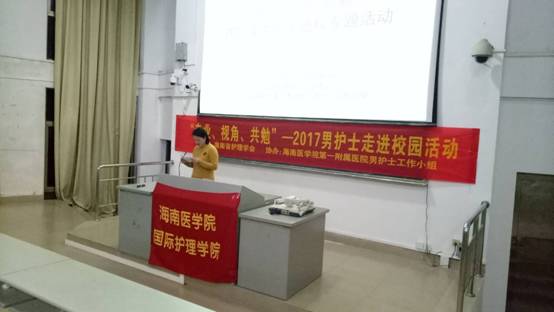 首先由海南省护理学会常务理事郭仁妃致辞,然后由 第一附属医院男护士工作小组的成员为同学们讲述了他们自己对男护士的看法同时分享了经过对男护士的社会地位所做的一些社会调查后得出的一些结论:男护士的社会舆论具有正能量;男护士的社会地位独树一帜;男护士的发展方向是多元化的;男护士的未来道路是一片宏伟蓝图。