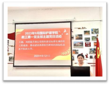 为贯彻落实党的二十大精神和习近平新时代中国特色社会主义思想主题教育, 学习海医党委《关于推进基层党支部建设提质增效的通知》要求, 国际护理学院教工第一党支部于 2023 年 9 月 21 日下午 15:30,在润深楼北 214 会议室召开了 9 月主题党日活动。会议集中学习《中国共产党章》、“巩固提升基 层党组织建设标准化规范化工程成效, 推动建设热带特色鲜明的国际化高水平 医科大学”相关内容、《关于六起“不担当、不作为”问题典型案例的通报》以及陈院士的开学第一课。本次会议由我院教工第一党支部组织委员周明主持,国际护理学院党委书记蒙伟、教工第一党支部书记蒋新军及第一党支部全体党员参加。
