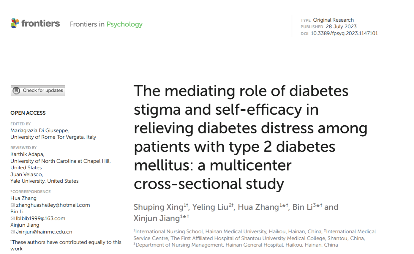 近日,我校2020级硕士研究生邢树平作为第一作者撰写的论文“The Mediating Role of Diabetes Stigma and Self-Efficacy in Relieving Diabetes Distress among Patients with Type 2 Diabetes Mellitus: A Multicentre Cross-Sectional Study”被国际期刊Frontiers in Psychology接收发表,