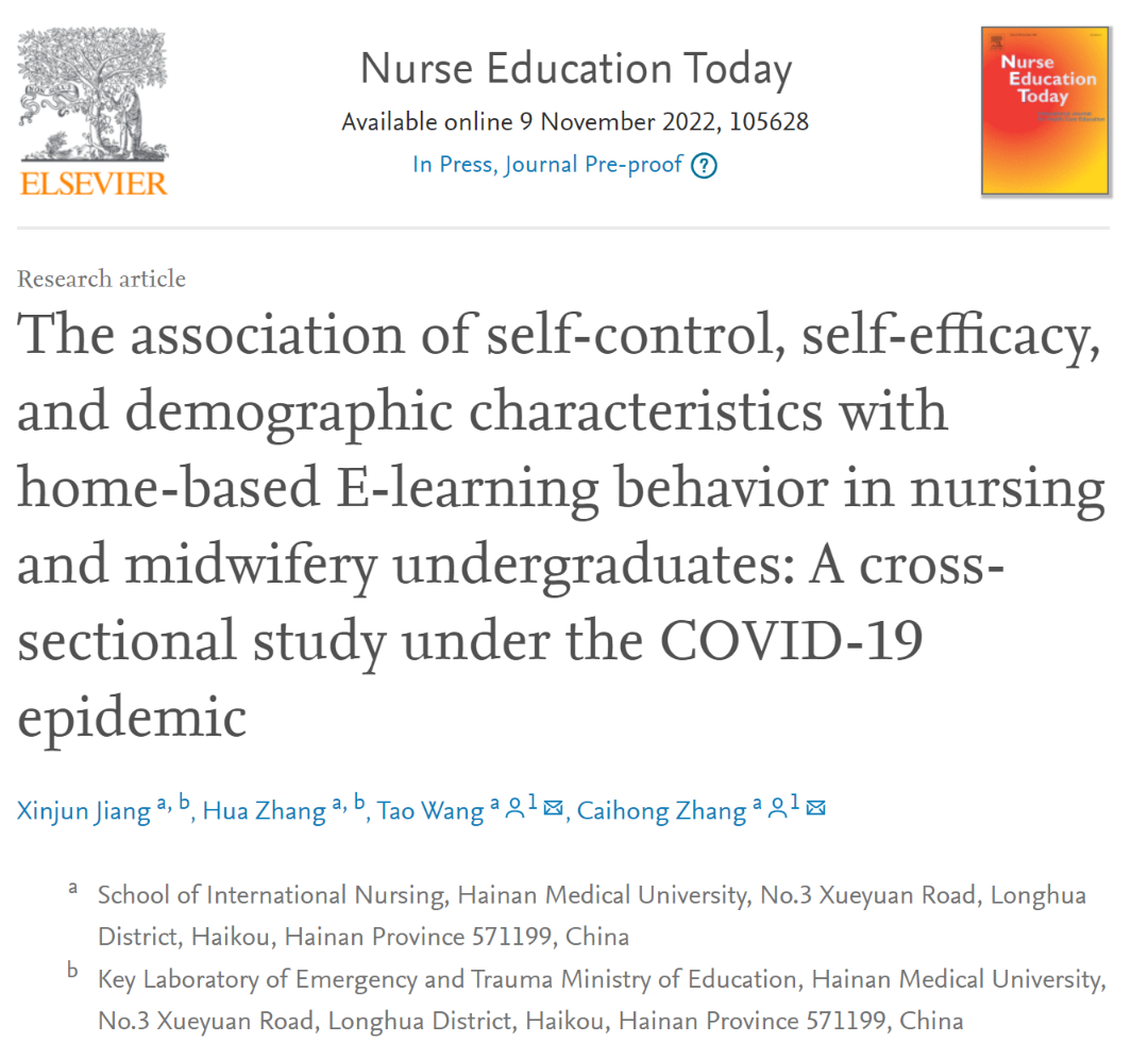 2022年11月09日, 国际护理学院蒋新军、张华及王涛等老师撰写的学术论文“The Association of Self-Control, Self-Efficacy, and Demographic Characteristics with Home-Based E-Learning Behavior in Nursing and Midwifery Undergraduates: A Cross-Sectional Study under the COVID-19 Epidemic”被国际护理学顶尖杂志《Nurse Education Today》接收并Online,该文第一作者为蒋新军老师,张华教授为第二作者,王涛教授为通讯作者。