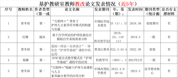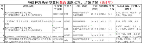 近5年来,基础教研室教师团队共立项教学改革课题8项,教改论文7篇,科研课题11项,科研论文10余篇,具体见表5-8.