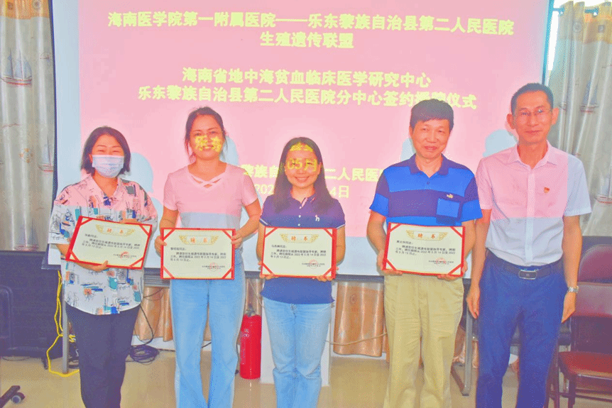 2022年5月14日, 第一附属医院生殖科联合乐东县第二人民医院开展了“心系病患,传递温暖”为主题的义诊活动, 旨在将生殖健康知识普及到基层。同时,由 第一附属医院牵头成立的海南省地方病(地中海贫血)临床医学研究中心乐东分中心正式揭牌成立。地中海贫血临床研究中心的建设目标是将该中心建设成为覆盖全省的地中海贫血防控和治疗的网络平台,前期已建立的分中心有海南省妇幼保健院分中心、 第二附属医院分中心、海南和泽生物科技有限公司分中心、海南省肿瘤医院分中心、三亚市妇幼保健院分中心、 附属海南医院分中心、儋州市人民医院分中心、东方市人民医院等10余家单位。此次建立的分中心为乐东县第二人民医院,乐东分中心的建立,不仅有利于地贫的防治工作开展,也有利于加强各单位之间的交流,促进海南的医疗发展,更好的服务自由贸易港的建设。