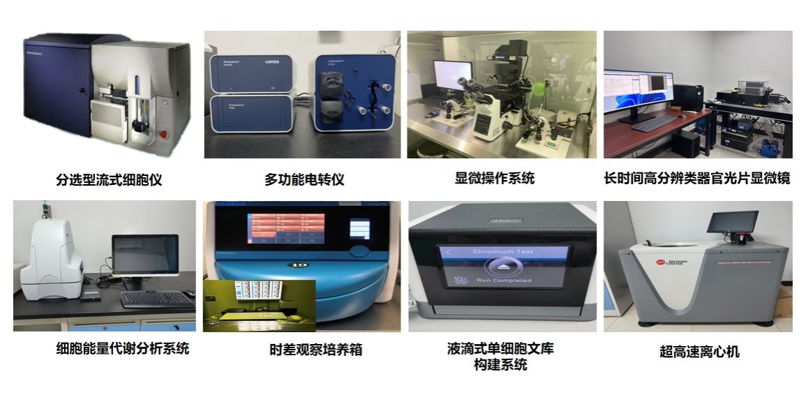 实验室拥有一批国际先进的仪器设备,包括细胞能量代谢分析系统Seahorse、超高速离心机、液滴式单细胞文库构建系统、时差观察培养箱、超高速分选型流式细胞仪(BD ArialⅡ)、长时间高分辨类器官光片显微镜、高通量二代测序仪(Life technologies)、一代测序仪(ABI3500)、MAXA 4D细胞核转染系统(Lonza)。