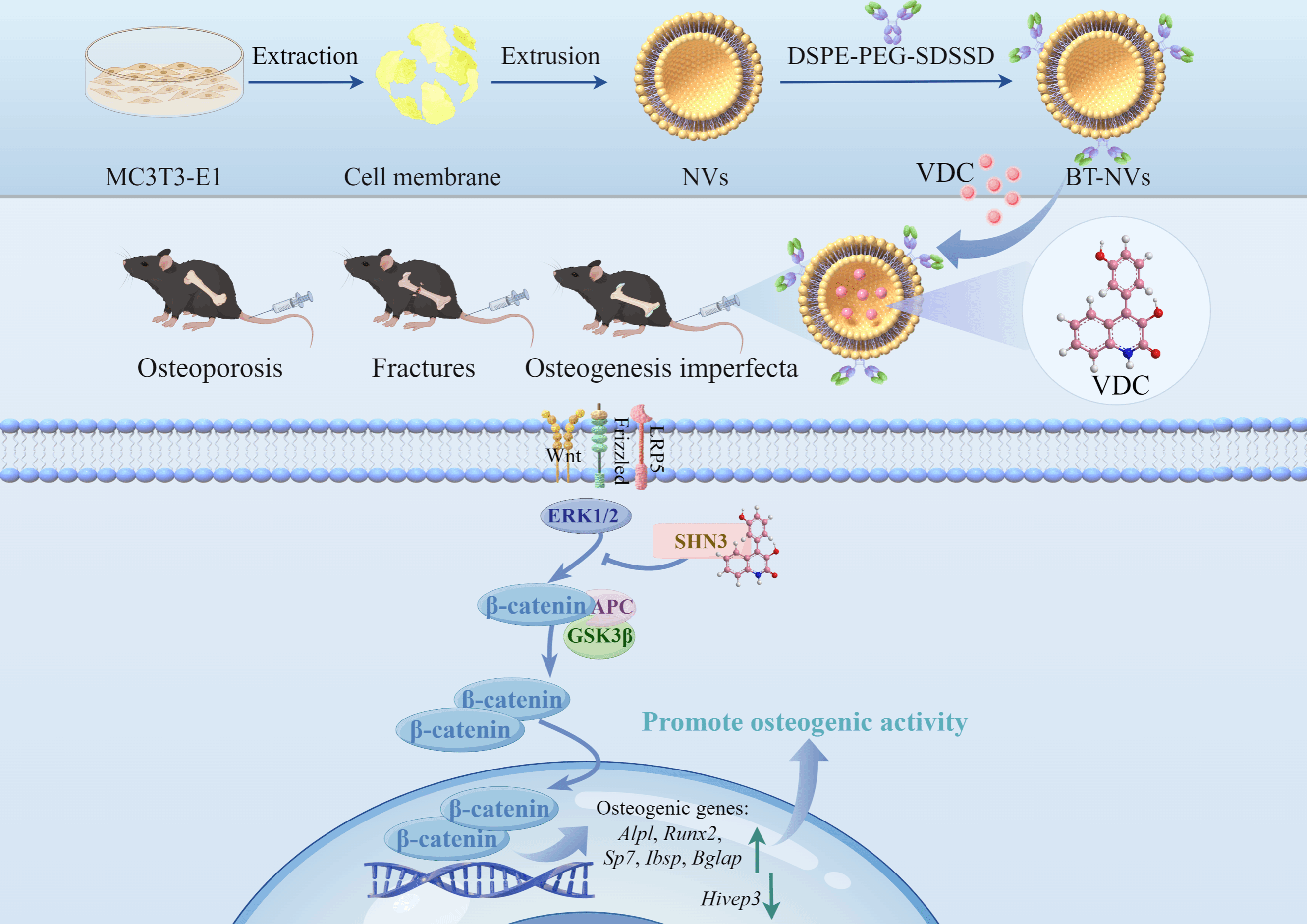 针对严重成骨不全(Col1a2oim/oim模型)的复杂骨病,团队创新性将海洋天然化合物与生物纳米技术结合,研发骨靶向纳米囊泡(BT-NVs)递送系统,通过骨靶向肽SDSSD偶联的成骨细胞膜生物纳米囊泡特异性识别骨组织,实现VDC的高效靶向递送,显著缓解成骨不全的骨丢失,为复杂骨病的精准治疗提供了新策略。